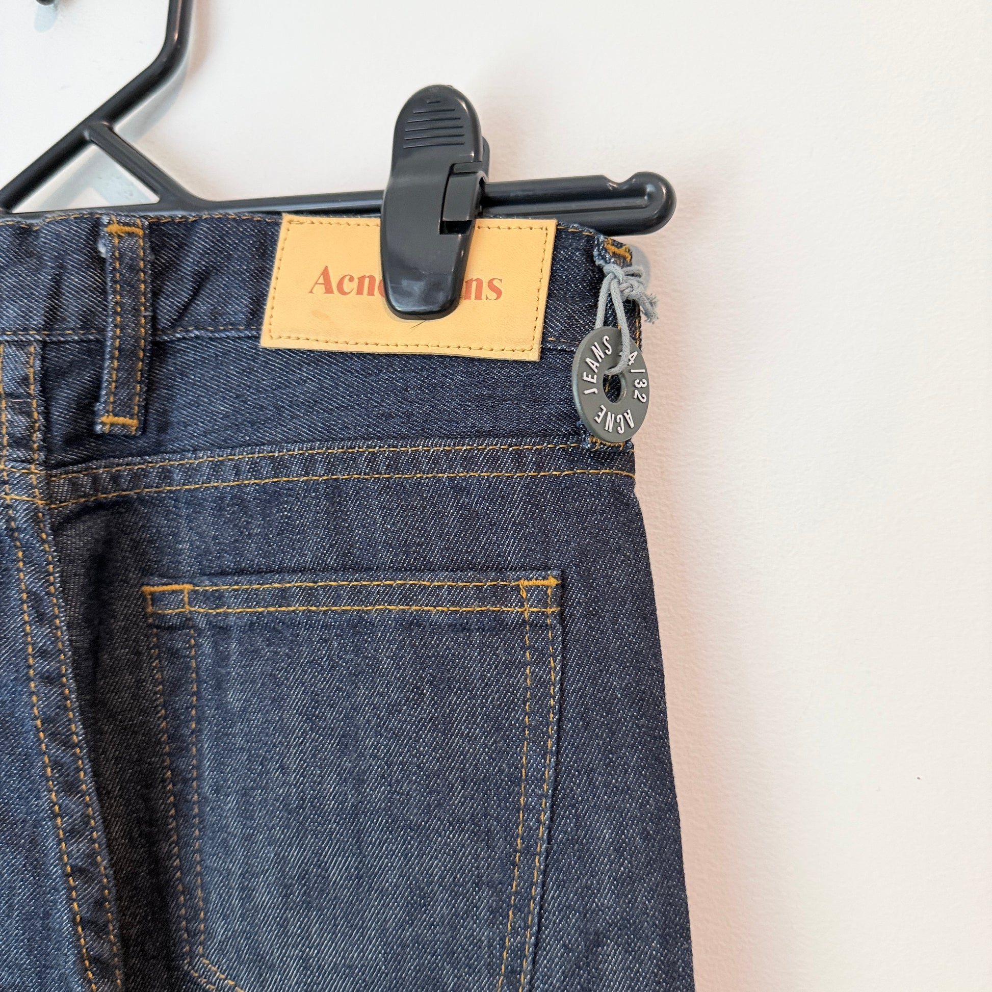 These Acne Studios 'Luv Blue' jeans are a high-value find, offering premium designer quality at a fantastic price. They feature a flattering high-waist fit and a stylish wide-leg/flare silhouette that is perfect for elongating the legs and creating a chic, modern look. The denim is a beautiful deep, dark blue wash with contrasting stitching and copper hardware, giving them an authentic, timeless feel. Made from quality, heavy-duty denim (no stretch information is visible, suggesting a traditional fit), these jeans are designed to last. If you appreciate quality denim, this is a handy one to have on hand!