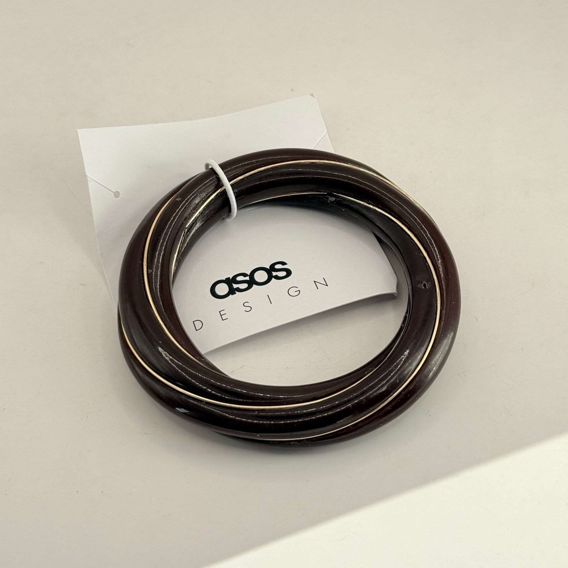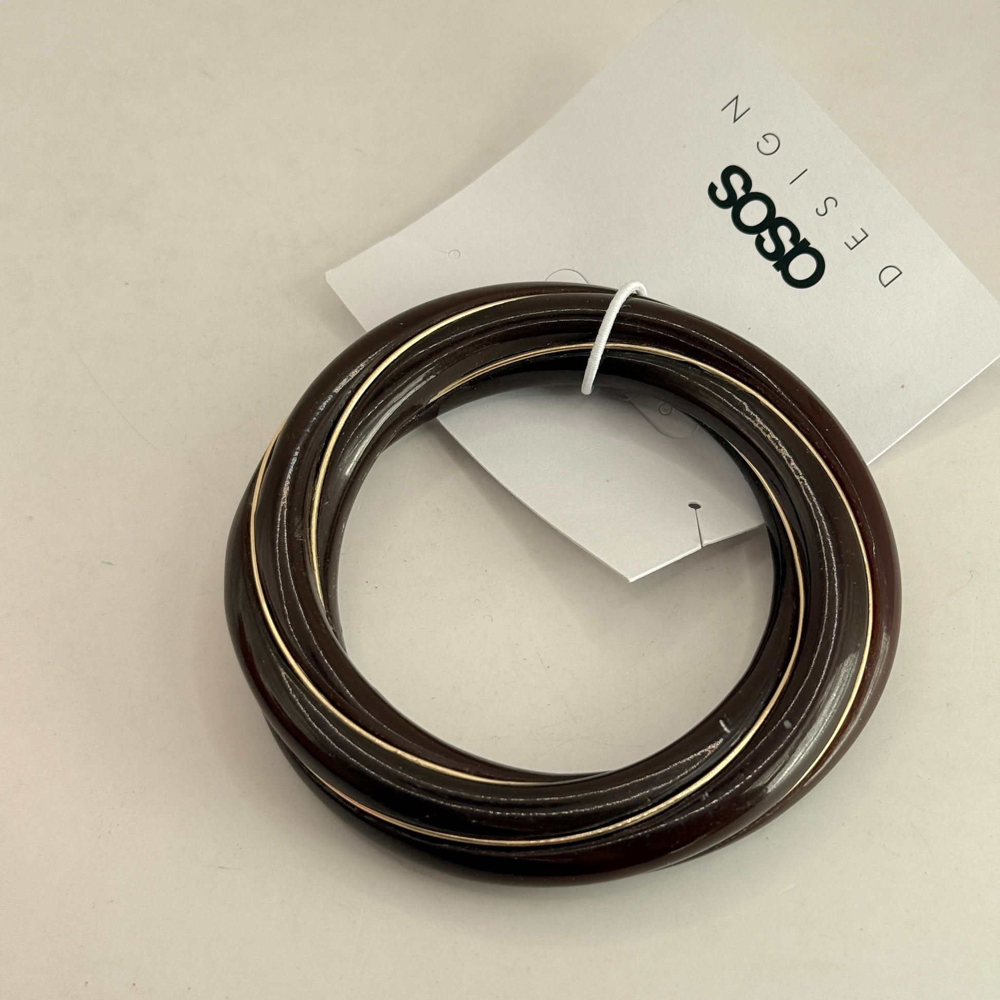 This is a really cool, chunky piece from ASOS DESIGN. It's a cuff-style bangle made from a dark brown resin with a sculptural, twisted look. What makes it stand out is the fine, gold-tone metal inlay that twists right around the band, catching the light nicely. It's a one-size piece and makes a great statement, handy for dressing up a simple knit or adding a bit of polish to your look.