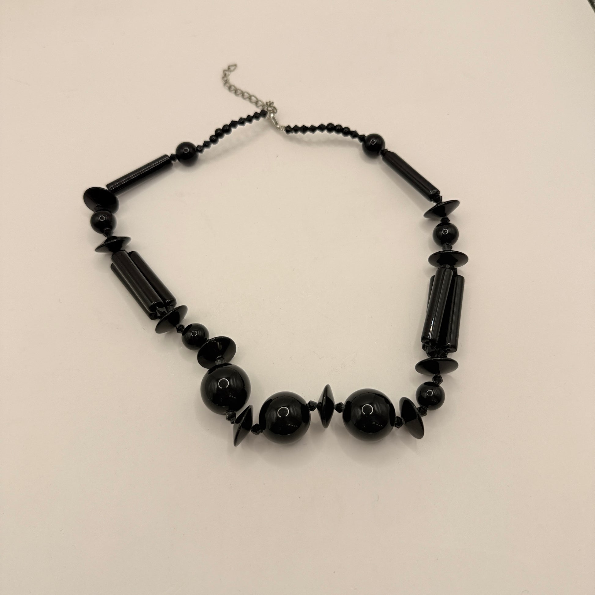 This black beaded statement necklace is a brilliant pick if you want something bold but still super versatile. The mix of round beads, tapered cylinder beads, and flat disc spacers gives it a striking geometric look, while the all-black colour keeps it classy and easy to pair with just about anything.