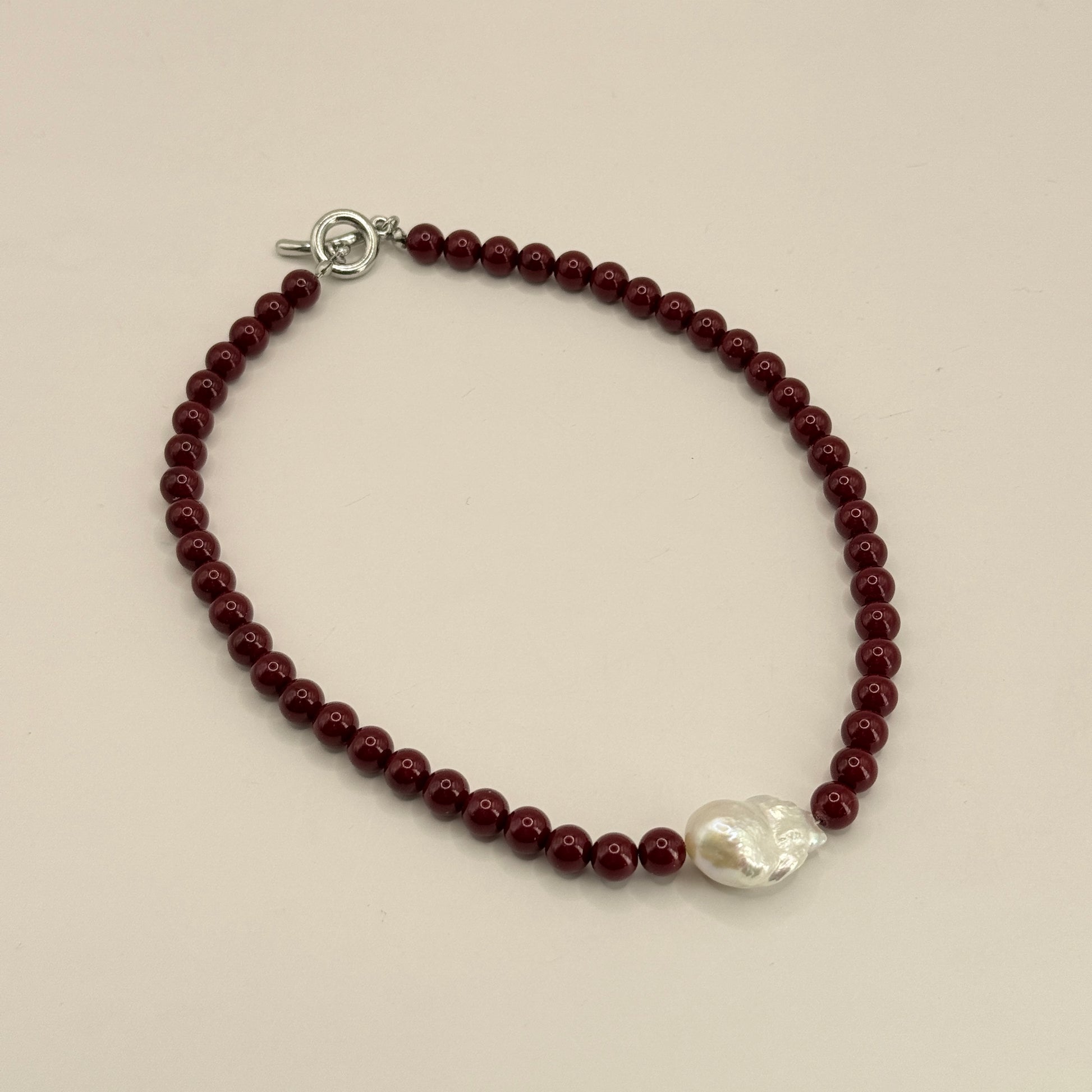 This is a seriously stylish line of necklaces that perfectly mixes modern edge with classic elegance. Each piece features a finely strung chain of small, polished beads combined with a beautiful, natural baroque pearl pendant. The pearl is always unique, with a gorgeous natural lustre and irregular shape. The style is finished with a secure toggle clasp closure. The deep red/burgundy beads and white pearl shown here give you a fantastic idea of the contemporary statement these pieces make.