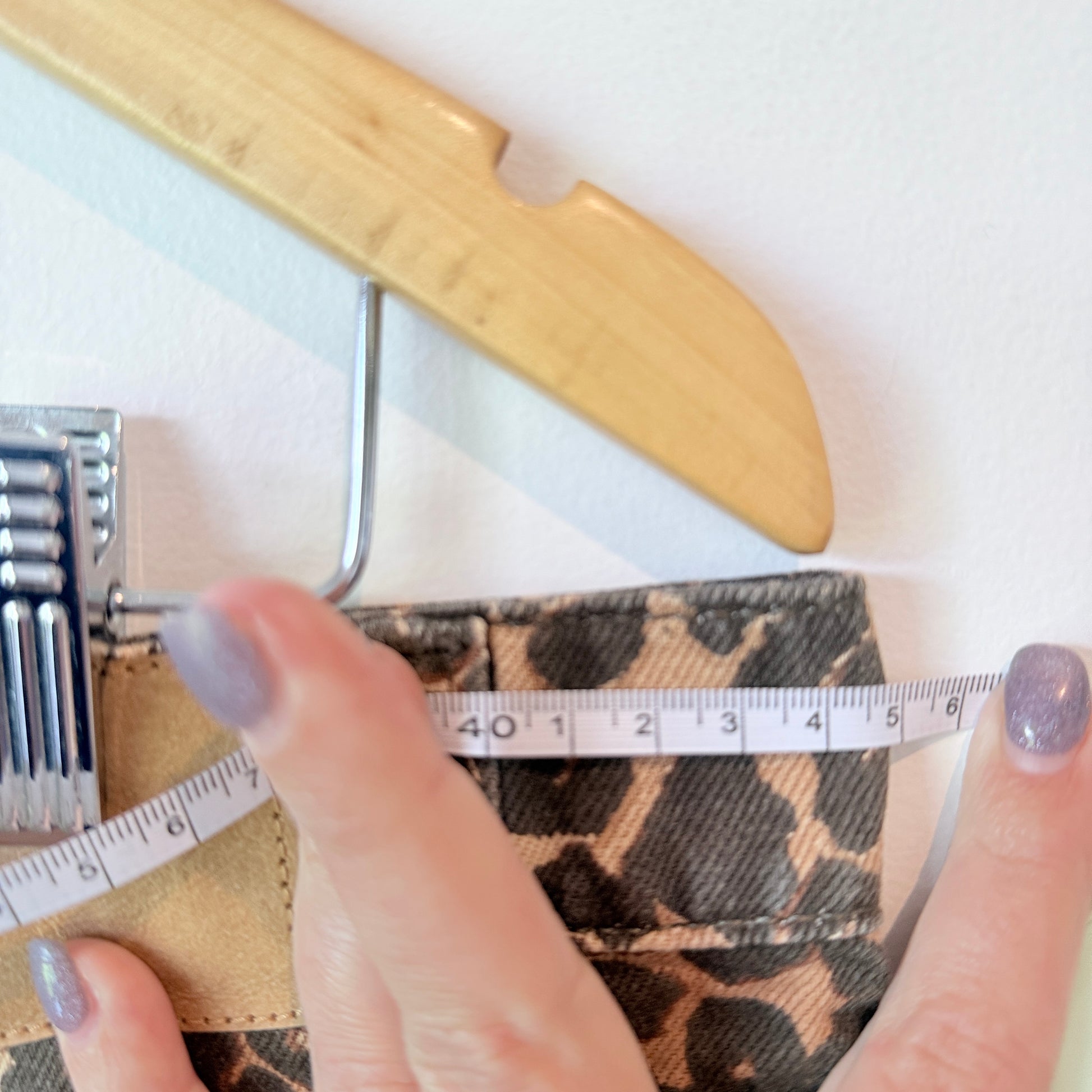 - Design: Denim-style skirt with a dark leopard print pattern (brown/tan/black tones). Features belt loops and front pockets.