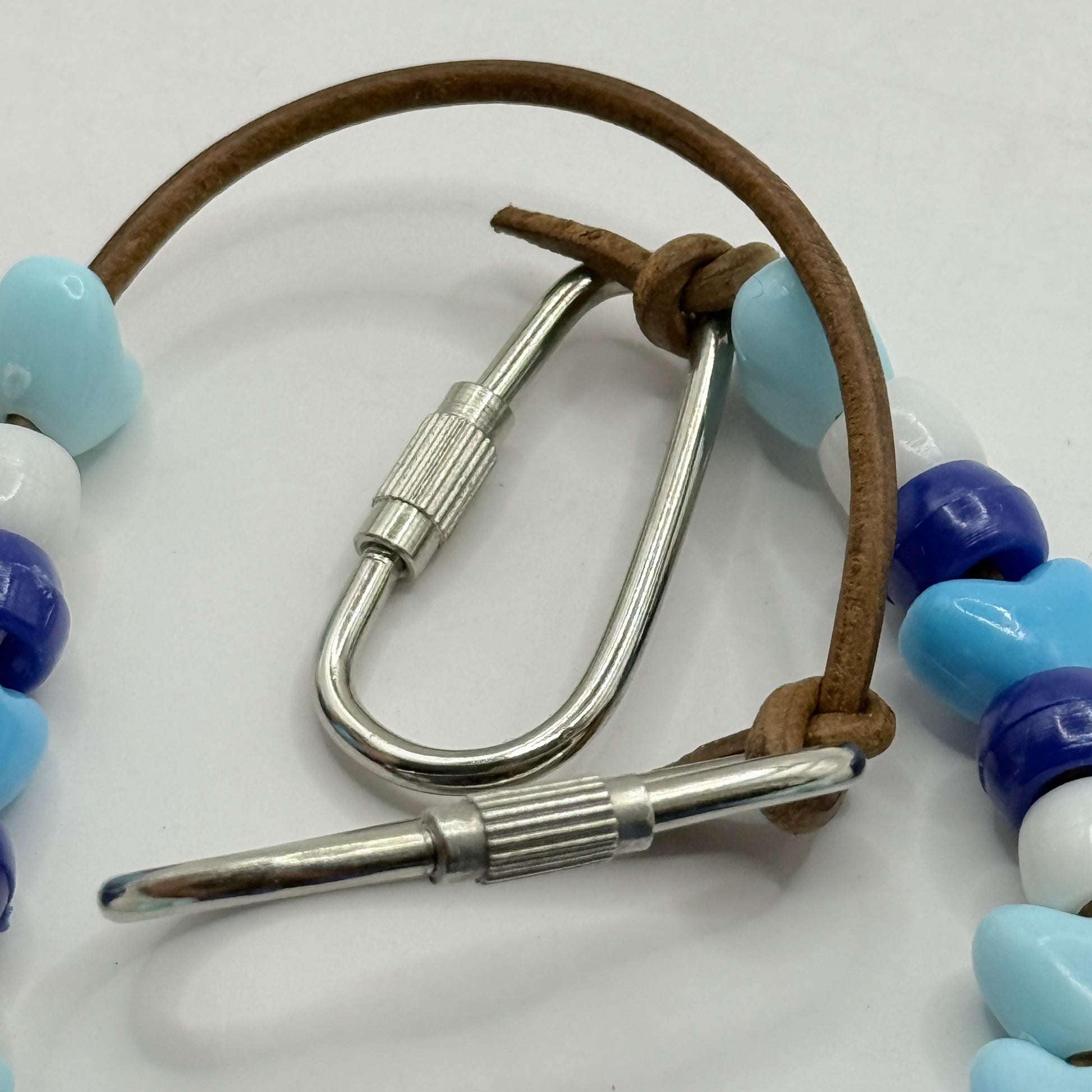 This hand-beaded name keychain features the name “SKYE” in bold blue letter beads, paired with a mix of blue, white, and heart-shaped beads for a soft, cheerful look. The beads are strung onto a brown cord, finished with two metal twist-lock clips so you can easily attach it to keys, school bags, pencil cases, or gift bundles. A sweet little accessory that adds a personal touch wherever it goes.