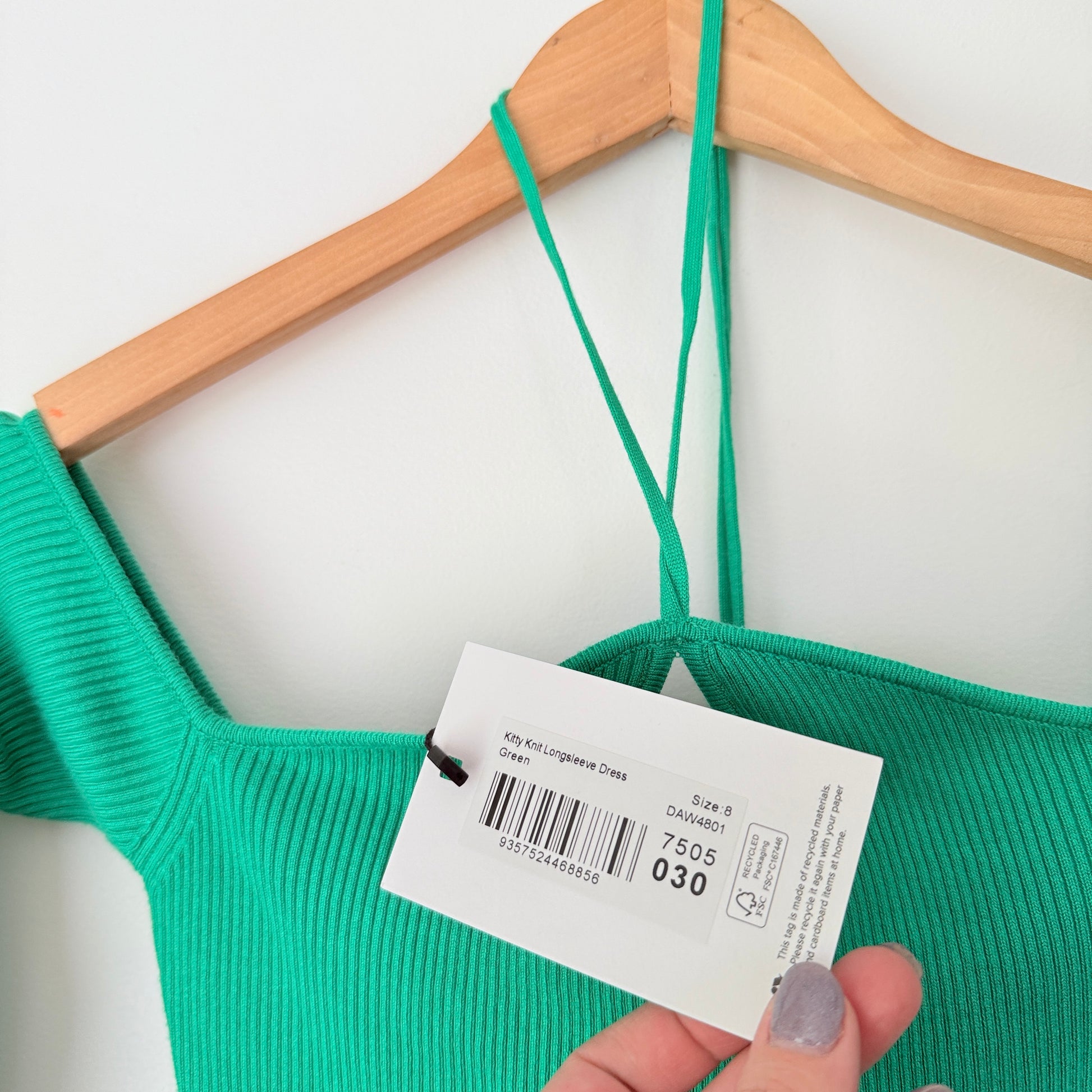 This is a stunning, brand-new dress from Dazie. It's the "Ktty Knit Longsleeve Dress" in a vibrant green. This ribbed knit mini features a unique off-the-shoulder design with long sleeves and a halter-neck tie that creates a cool keyhole cutout. It's a real head-turner, perfect for a night out.