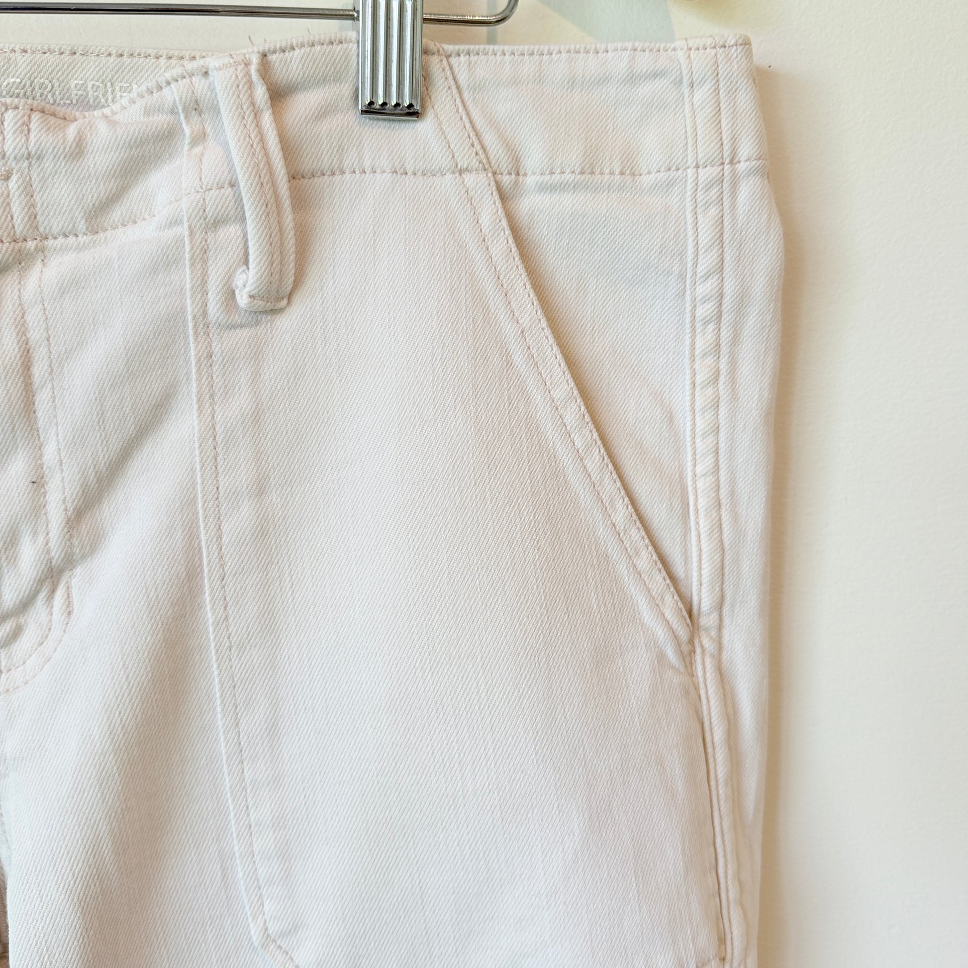 - Design: Cropped or ankle-length pants in a light, pale pink or off-white color. They have contrasting stitching visible on the pockets and seams.