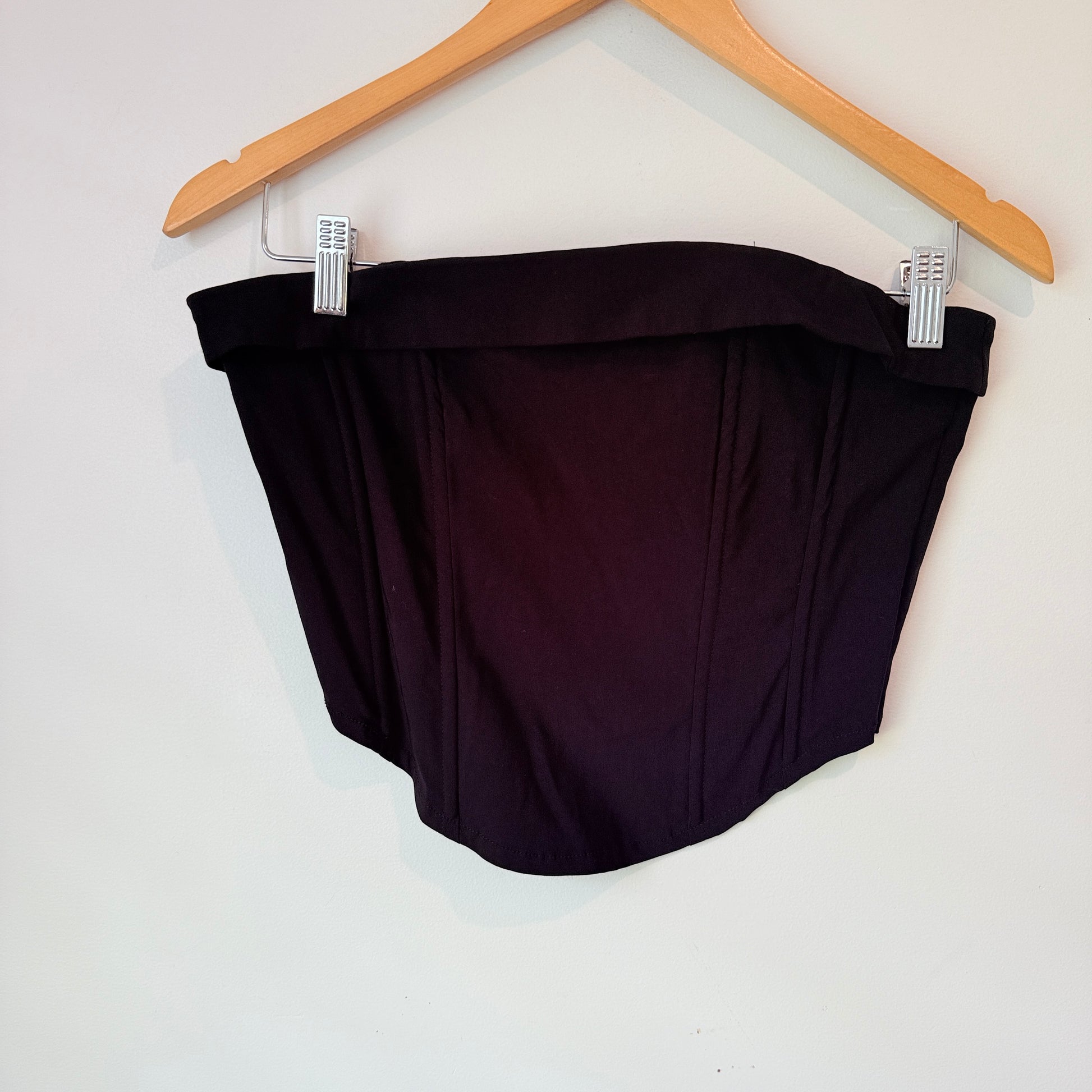 This black corset-style bustier top brings architectural tailoring and wardrobe versatility together in a piece that pairs easily with skirts, high-waisted trousers, or denim. Designed with structured vertical seams that create a contoured silhouette and a subtle fold-over neckline, it makes a bold yet wearable statement. The clean black finish and classic cut give it timeless appeal — a great addition if you’re after something that elevates both casual and dressier looks.