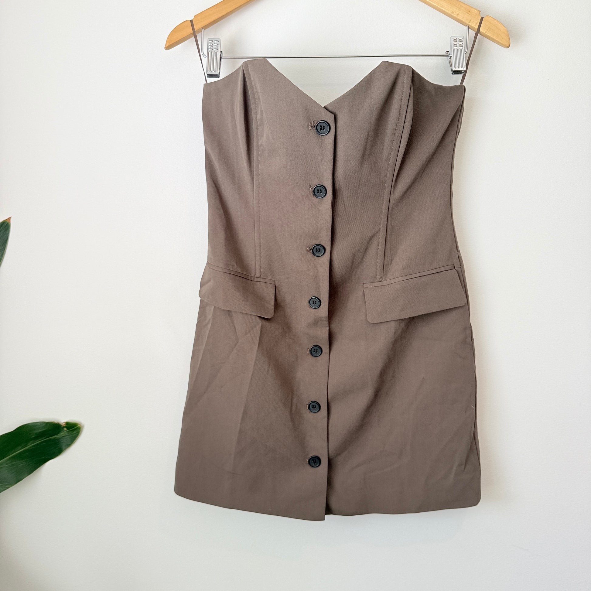 - Style: Strapless button-front dress