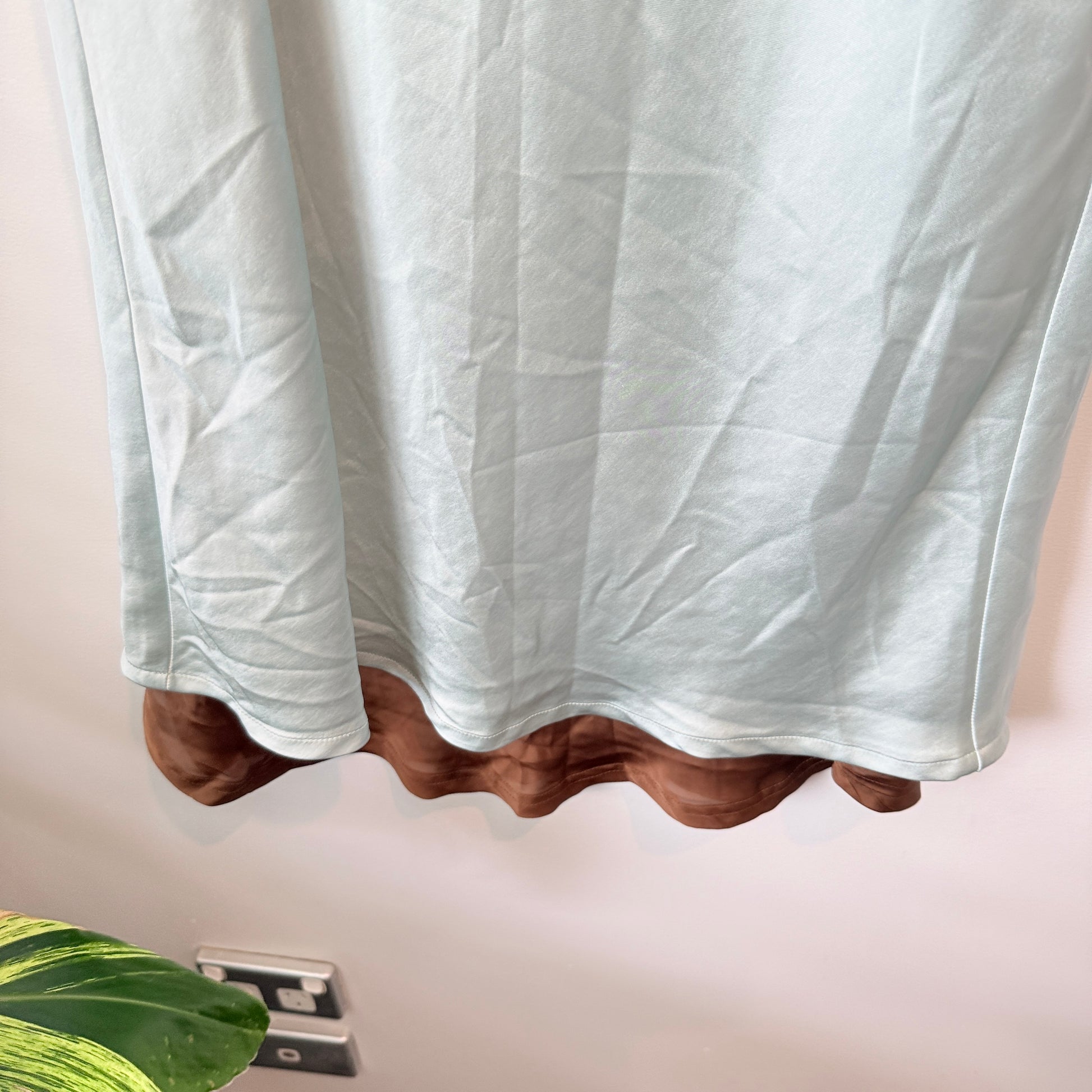 - Color: Mint Green / Sage with Brown Hem