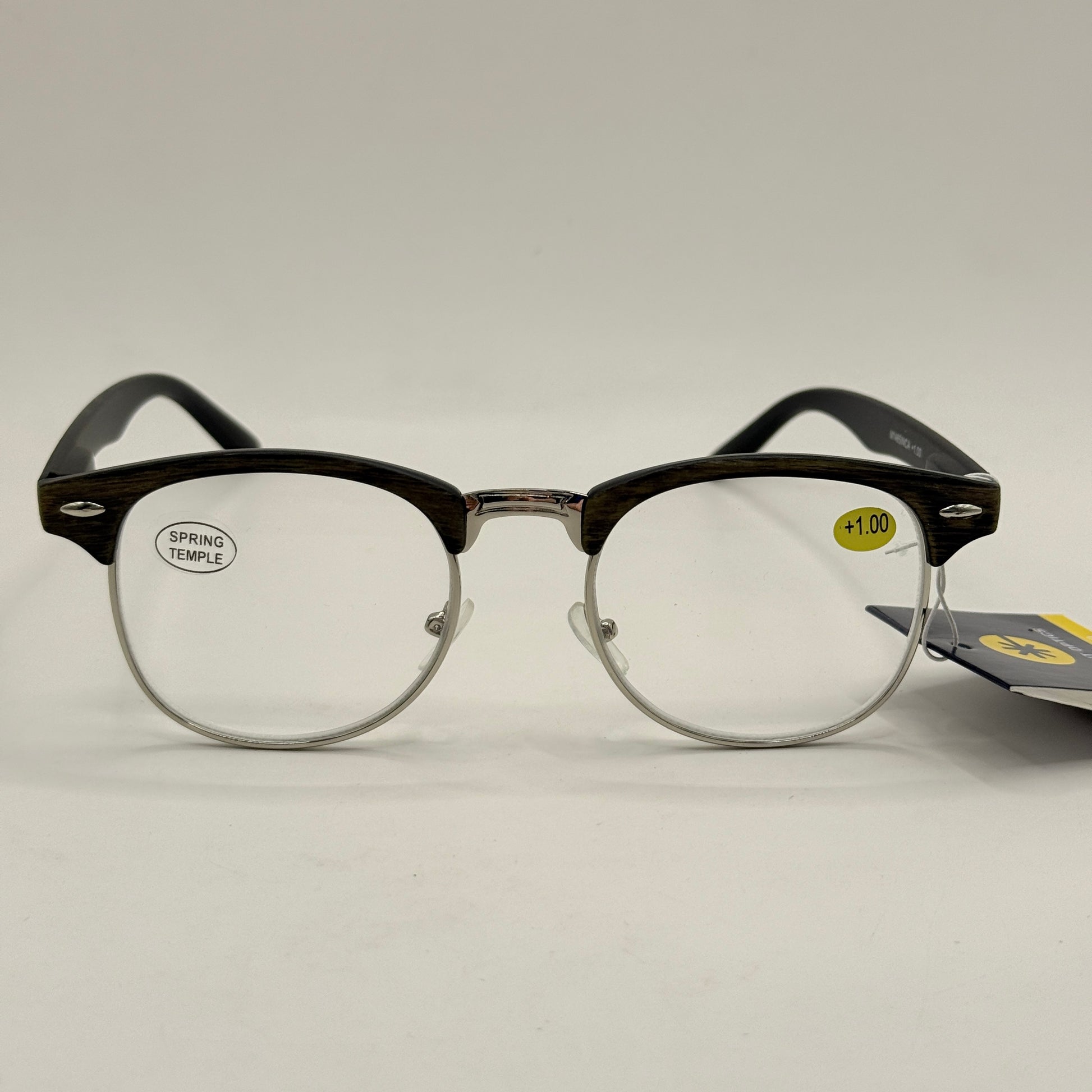 These stylish reading glasses feature a browline design with a wood-look finish, giving them a polished, timeless feel while still being easy to wear day-to-day. The semi-rimless shape keeps things light on the face, and the spring-temple arms add extra comfort and flexibility. With +1.00 magnification, they’re a handy option for light reading, screens, and close-up tasks where a little extra clarity helps.
