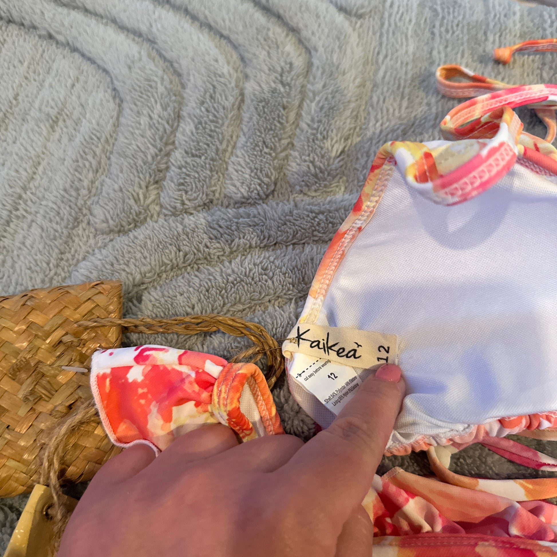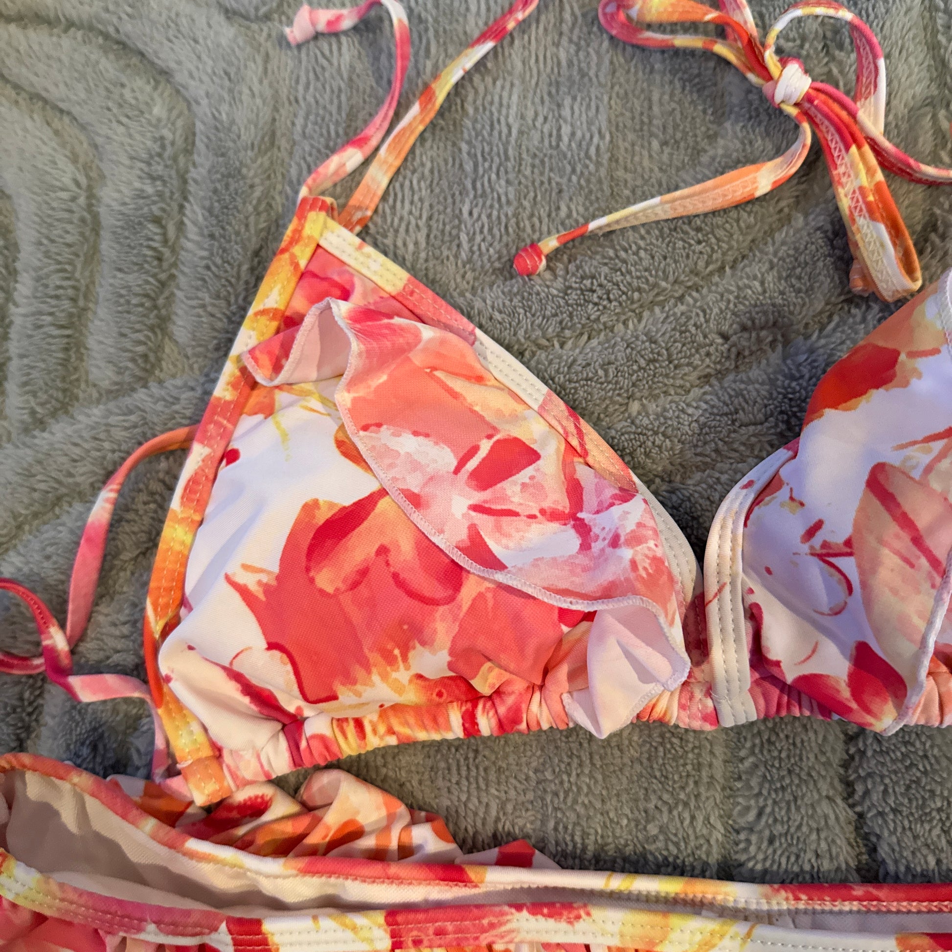 If you are after a swimwear look that feels full of life and energy, this matching set is a brilliant choice. The design features a classic triangle top and matching bottoms, both finished with sweet ruffle trims that add a bit of movement and feminine flair. The print is a vibrant mix of warm tropical tonesāpinks, oranges, and yellowsāwhich look fantastic against the water. With adjustable ties at the neck and back, you can get the fit just right for comfort, while the little gold bird charm on the hip adds a lovely, unique touch to the finish. Itās a ready-to-go outfit for the pool or the beach that feels special but totally practical.