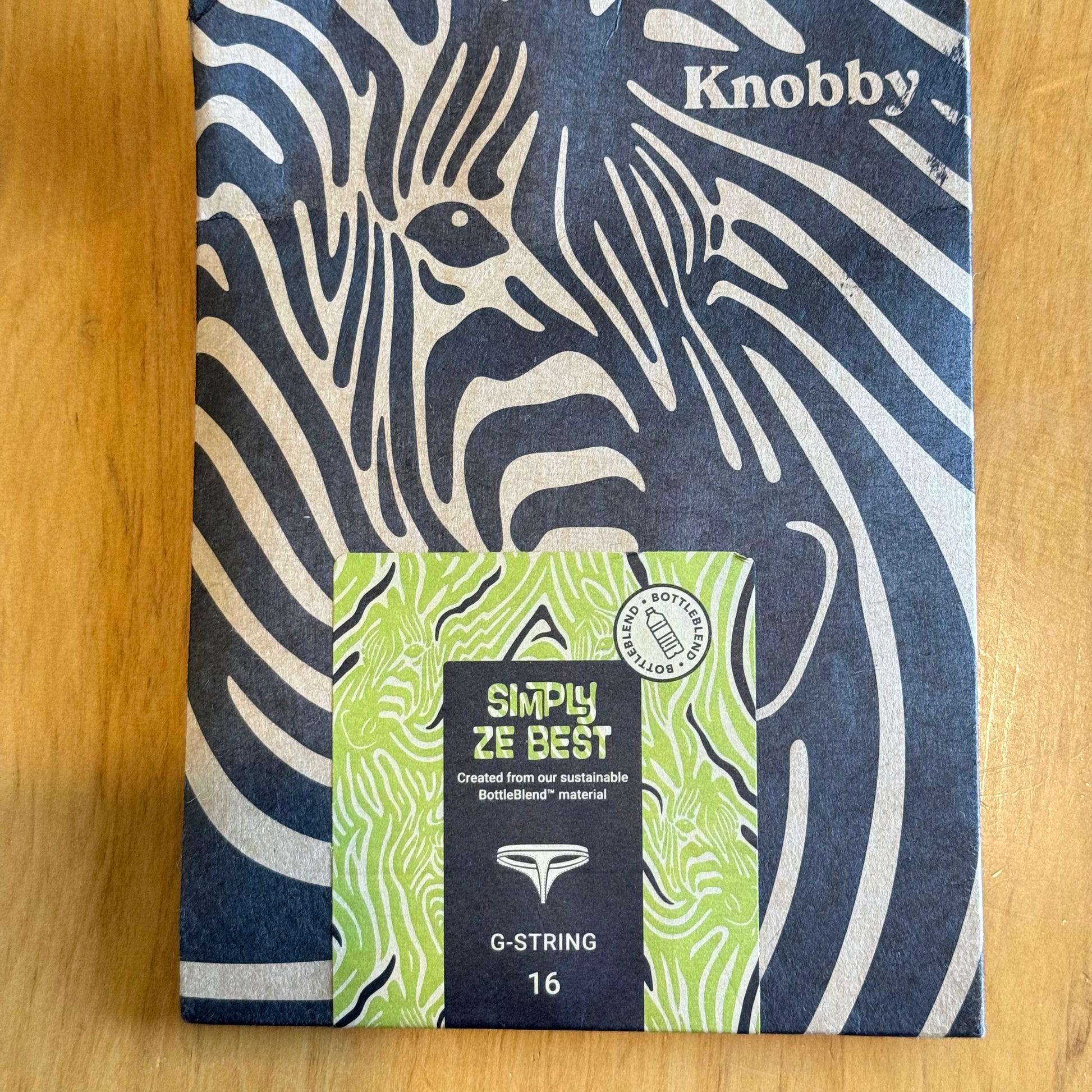 Here is a fun and comfortable essential from Knobby. This G-String, named "Simply Ze Best", comes in a cool, vibrant zebra print and is still in its original, sealed packaging, meaning it is brand new and never worn. Knobby is well-known for their unique designs and comfy fit.