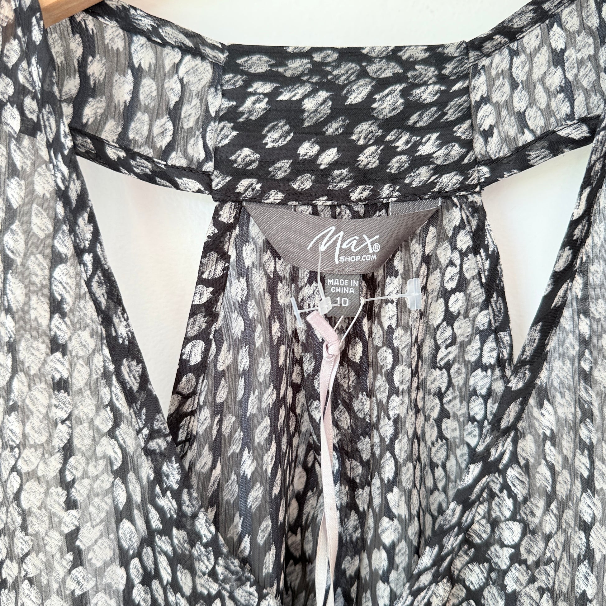 Here’s a beautiful, floaty piece from Max that's perfect for layering. It's the Angler Dress in a Size 10, featuring a striking Black Multi abstract print. The fabric is a light, sheer material that drapes beautifully. It has a stylish high-neck design with keyhole cutouts at the front and back. This is a stunning piece to wear over a slip dress or a cami and pants, letting you dress it up or down.