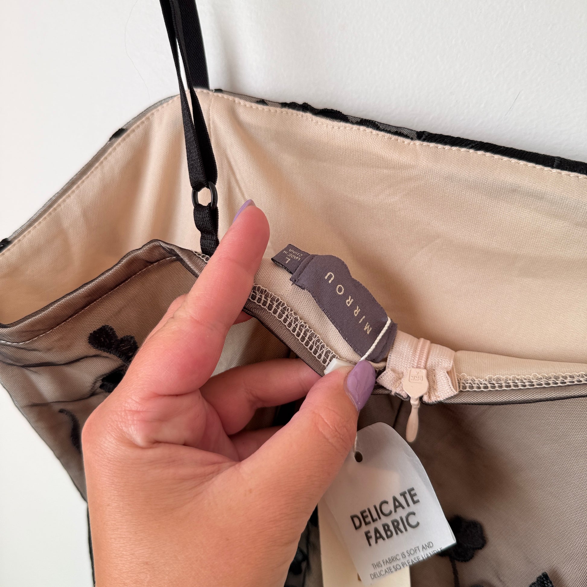 - Colour: Black overlay on neutral lining