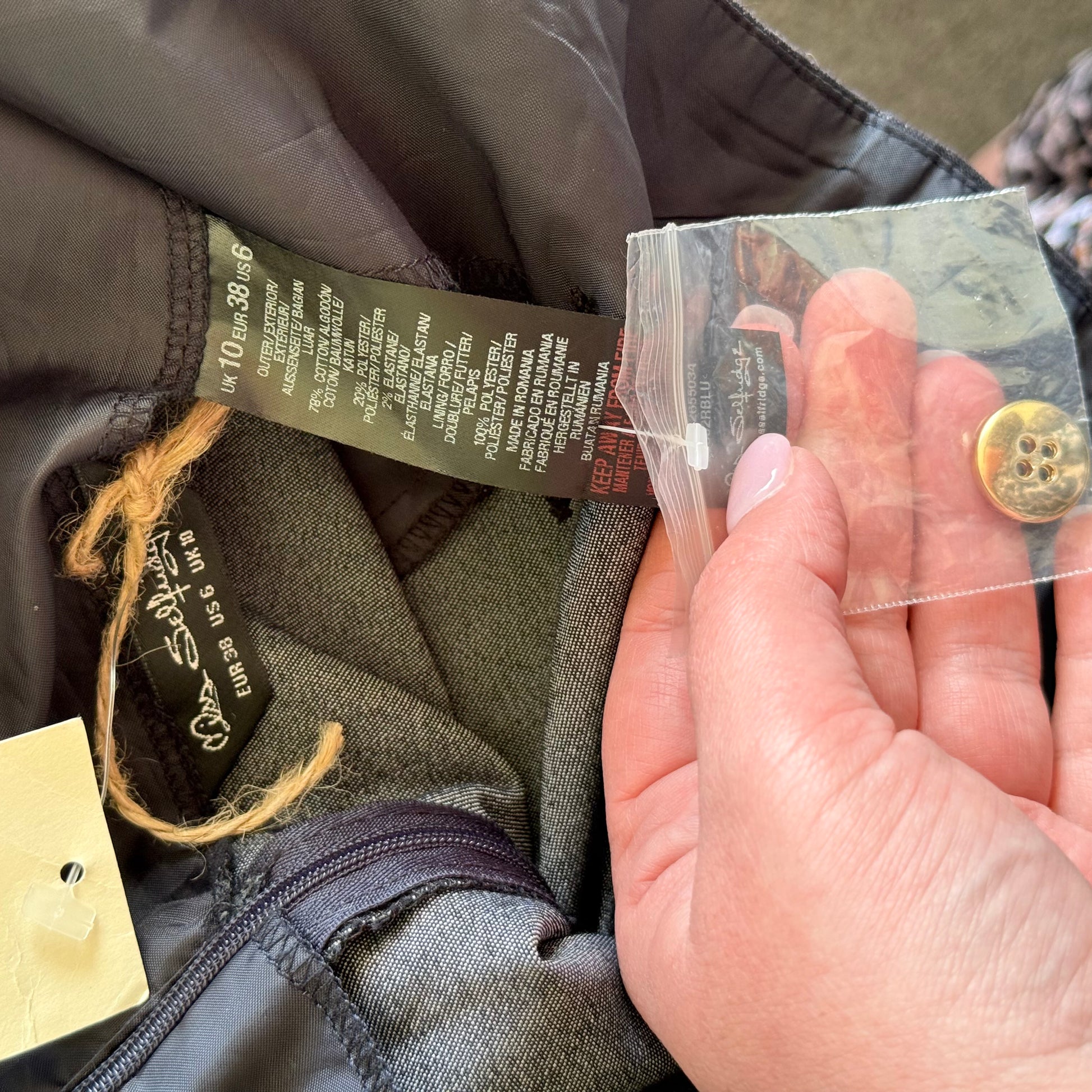 - Condition: Brand New with Tags (BNWT), never worn. Includes spare button attached.