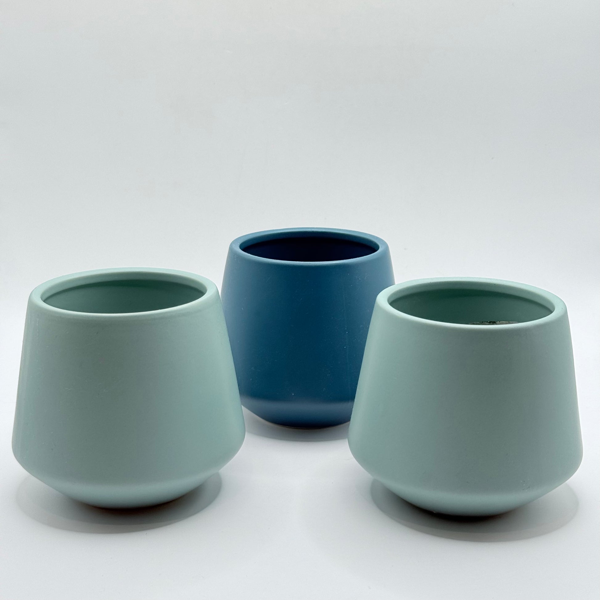 This is a beautiful set of three ceramic pots to bring a fresh, contemporary look to your home. They all share a simple, modern tapered shape and a smooth, matte finish. The set includes two matching pots in a soft mint green/blue (marked as KG DREAM POT 10CM) and one in a slightly darker matte denim blue. They're perfect for succulents, herbs, or small house plants and instantly elevate any shelf or window.
