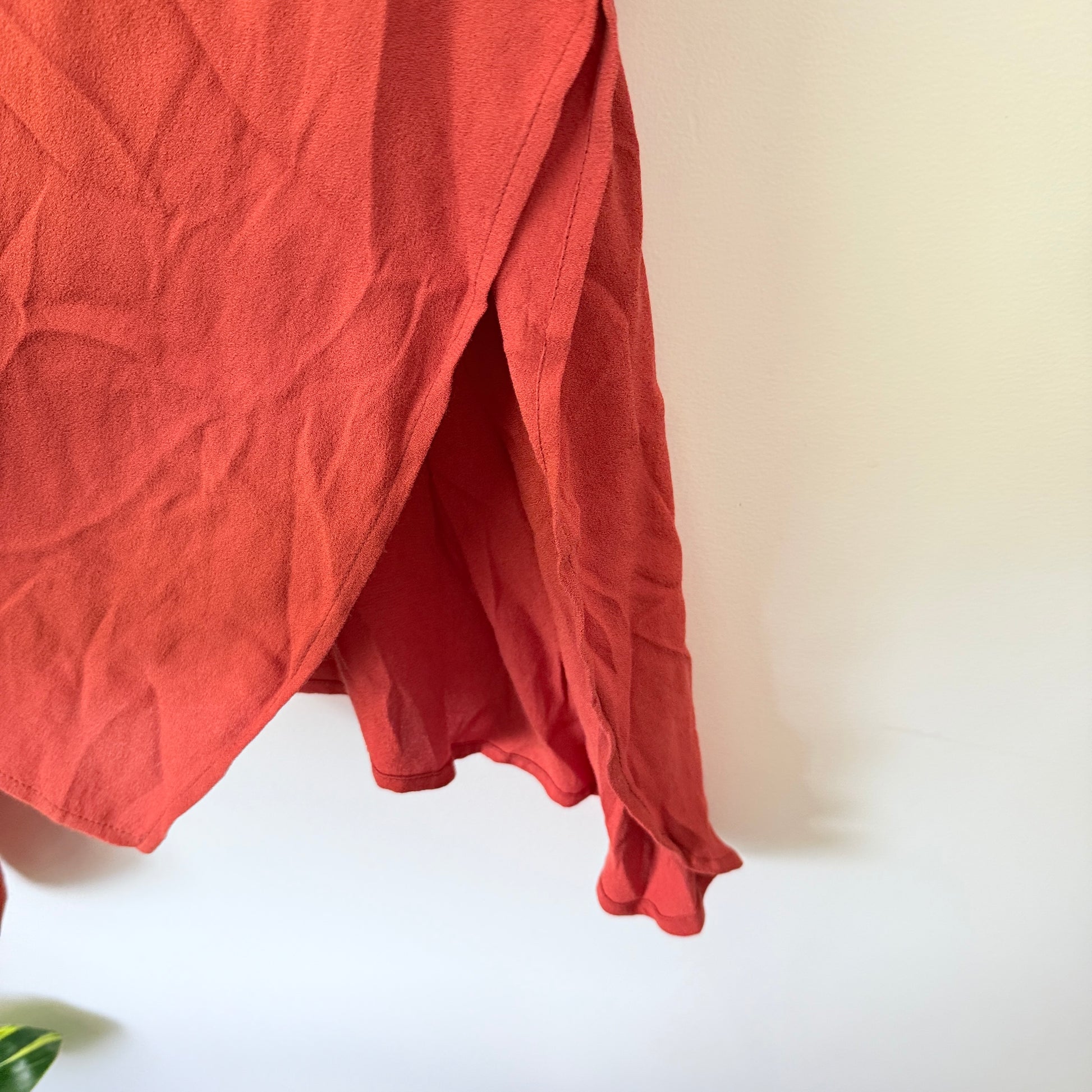This is a beautiful, brand-new top from NES Boutique. It's the famous Civita Top, known for its oversized, flowy silhouette and clever split-side detailing that can be tied up or left loose. This one comes in a stunning Terracotta colour and is made from a lightweight Viscose fabric, making it perfect for any season.