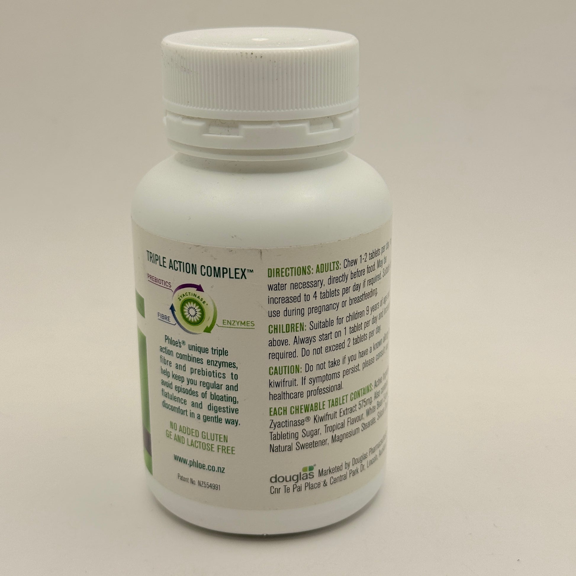 Phloe has a triple action through the activity of enzyymes,prebiotics and fibre isolated from New Zealand Kiwi Fruit.