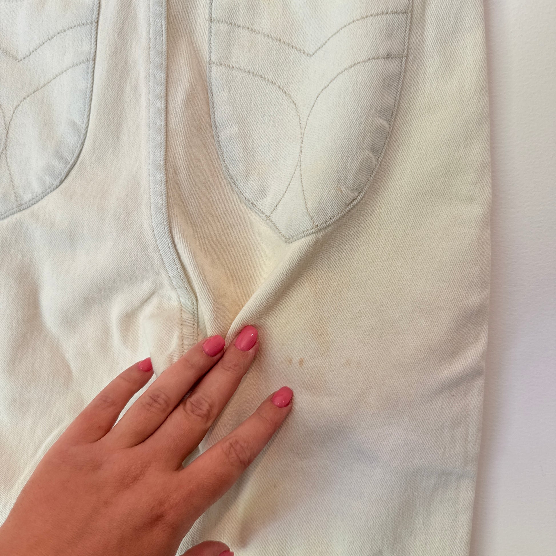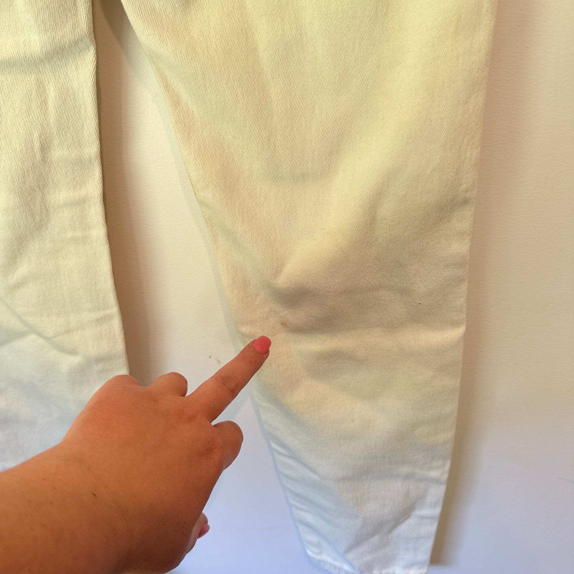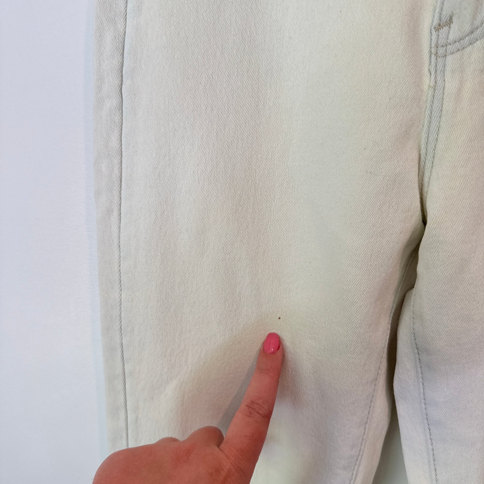 - Noted Flaw: There are a few small, faint light brown marks on the lower back left leg area.