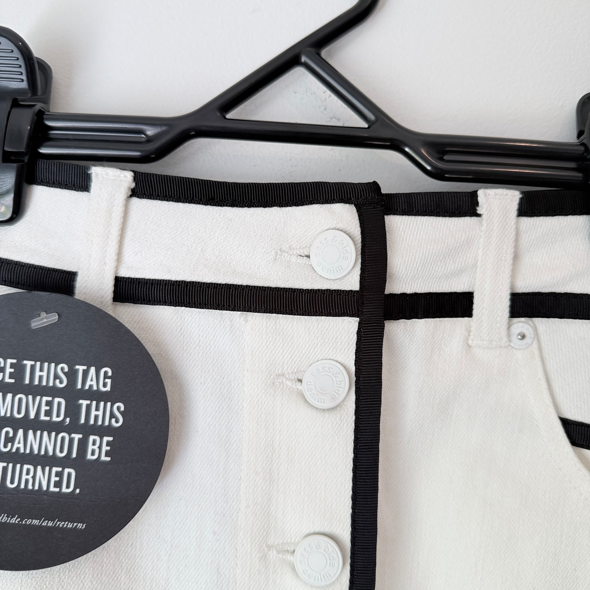 This eye-catching skirt is designed to make a fun, modern statement! It features crisp white denim contrasted by bold, graphic black stripe detailing that runs vertically and horizontally, giving it a playful, structural feel. The silhouette is a classic mini with a full button-front closure, making it an absolute winner for casual events, festivals, or whenever you want a standout piece that pairs easily with simple tops.