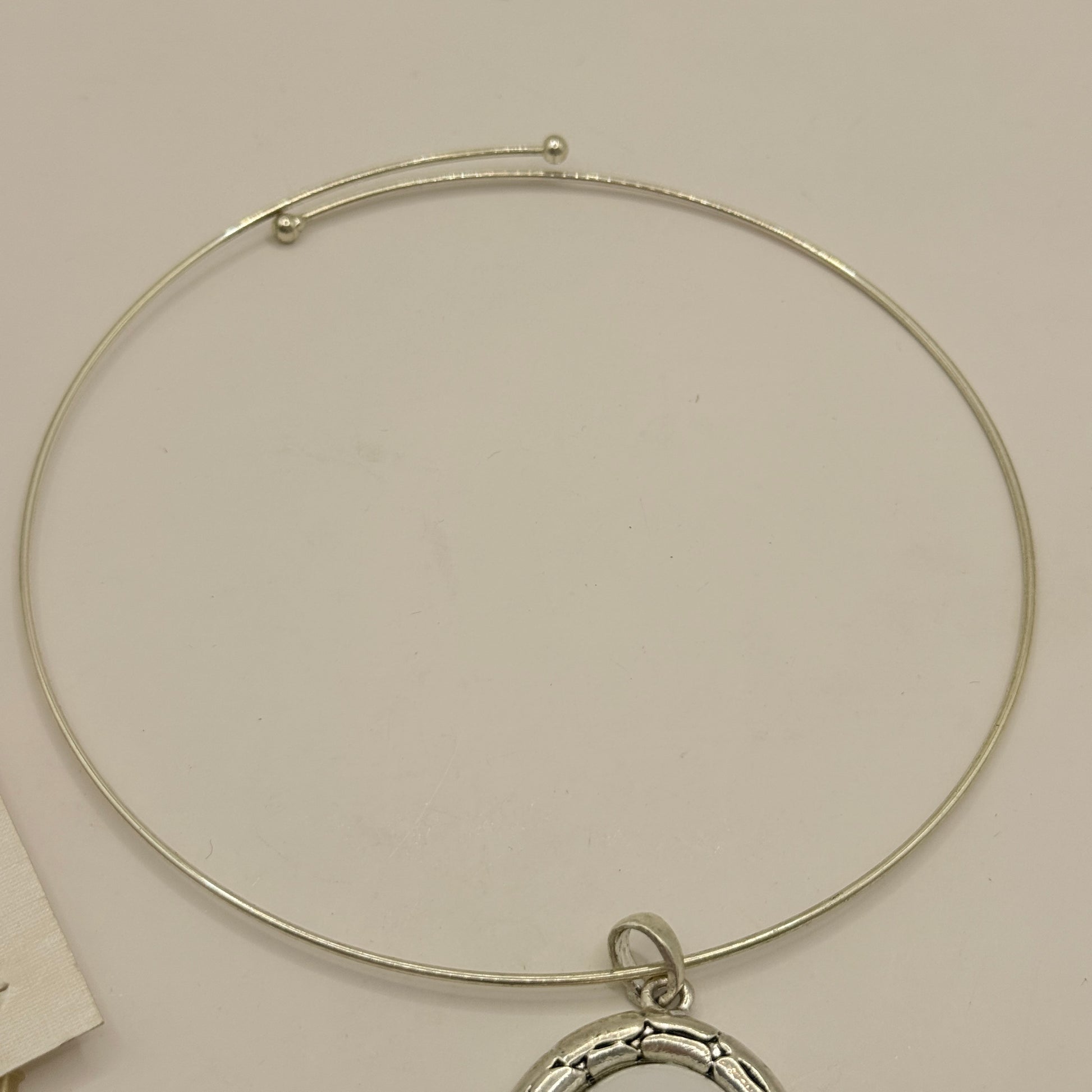 This refined set features a sleek silver-tone choker necklace paired with coordinating oval drop earrings, each showcasing a smooth white stone centre framed by an intricately textured silver-tone border. The minimalist choker design gives the pendant a clean, modern look, while the matching earrings add a touch of sophistication without feeling too heavy.