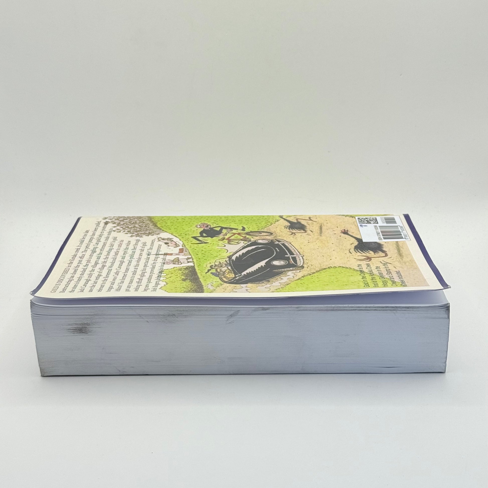 Gold in the Creek, the first chronicle of the declining coastal village of Kotuku has ex-postmaster Jack Cavanagh at the bowling club AGM fighting to stop its sale when word comes of a gold strike in the local creek. Everybody rushes to the creek, including the posh retirement folk and local clergy. The good news for drug entrepreneur Bob Rogers is the increased traffic, the bad news is his cash crop is nearby. Storekeeper Ron Atkinson sells out of digging implements, his wife cranks up the pie-making, pub owner Ruby Brough instructs husband Bert to order more beer while she dives into the creek. Gold-seeking riffraff swarm in and create mayhem. Bob Rogers does brisk business while protecting his assets with arson and dynamite. He goes too far, trying to ransom Cavanagh's daughter. Jack is now fighting for her life.