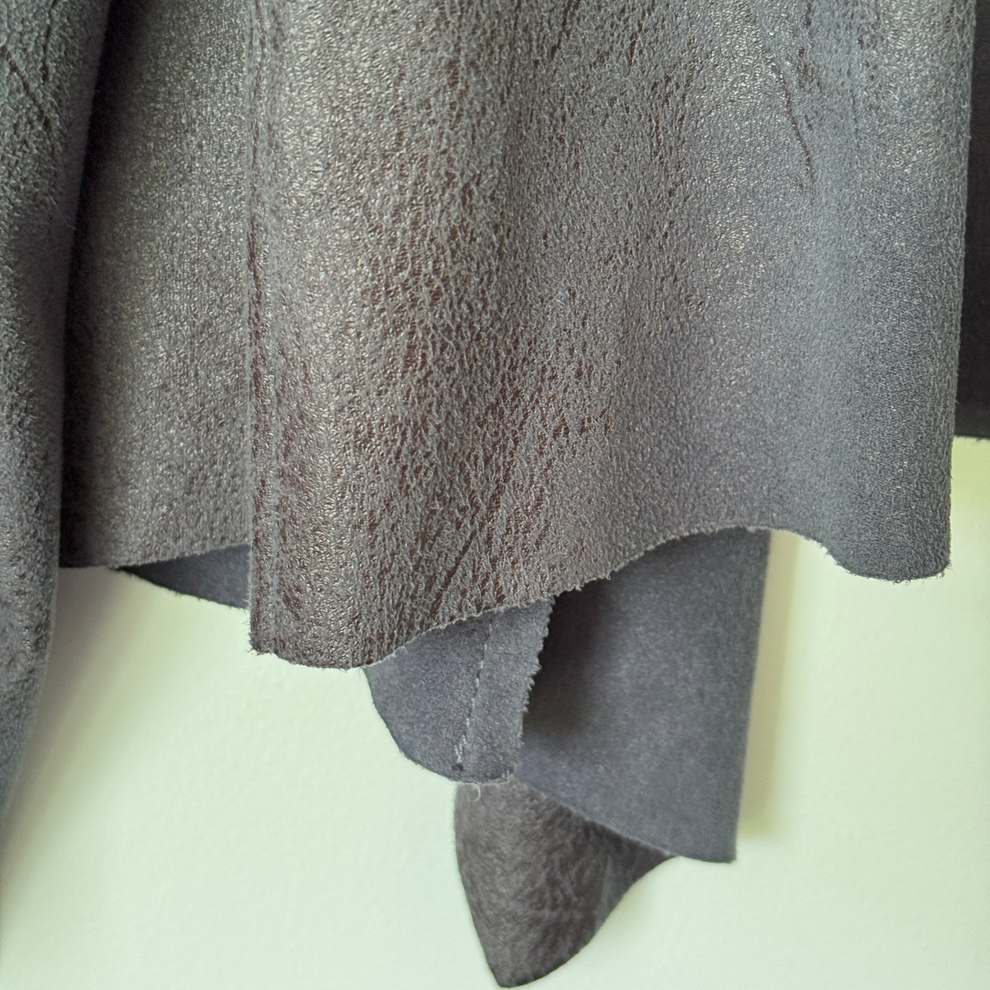 - Design and Condition: Grey faux suede jacket with draped open front, zipped pockets, and a cascading hem.